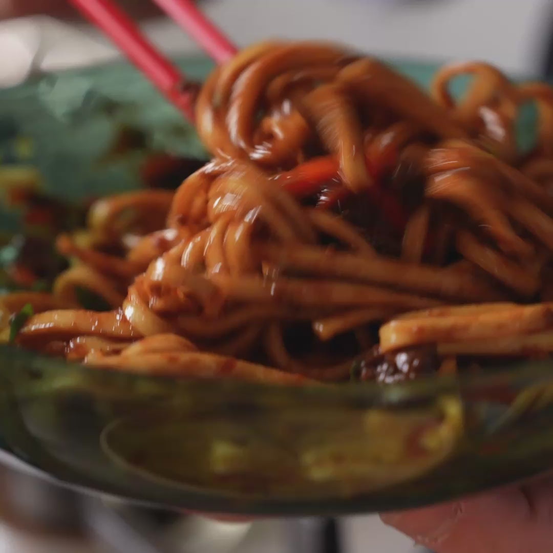 Chewy wheat noodles topped with a rich soybean-based sauce. Savory and a little sweet, this Beijing classic combines premium dark soy with fermented soybean paste in a thick, comforting sauce. Top it with carrot and cucumber slices for freshness!