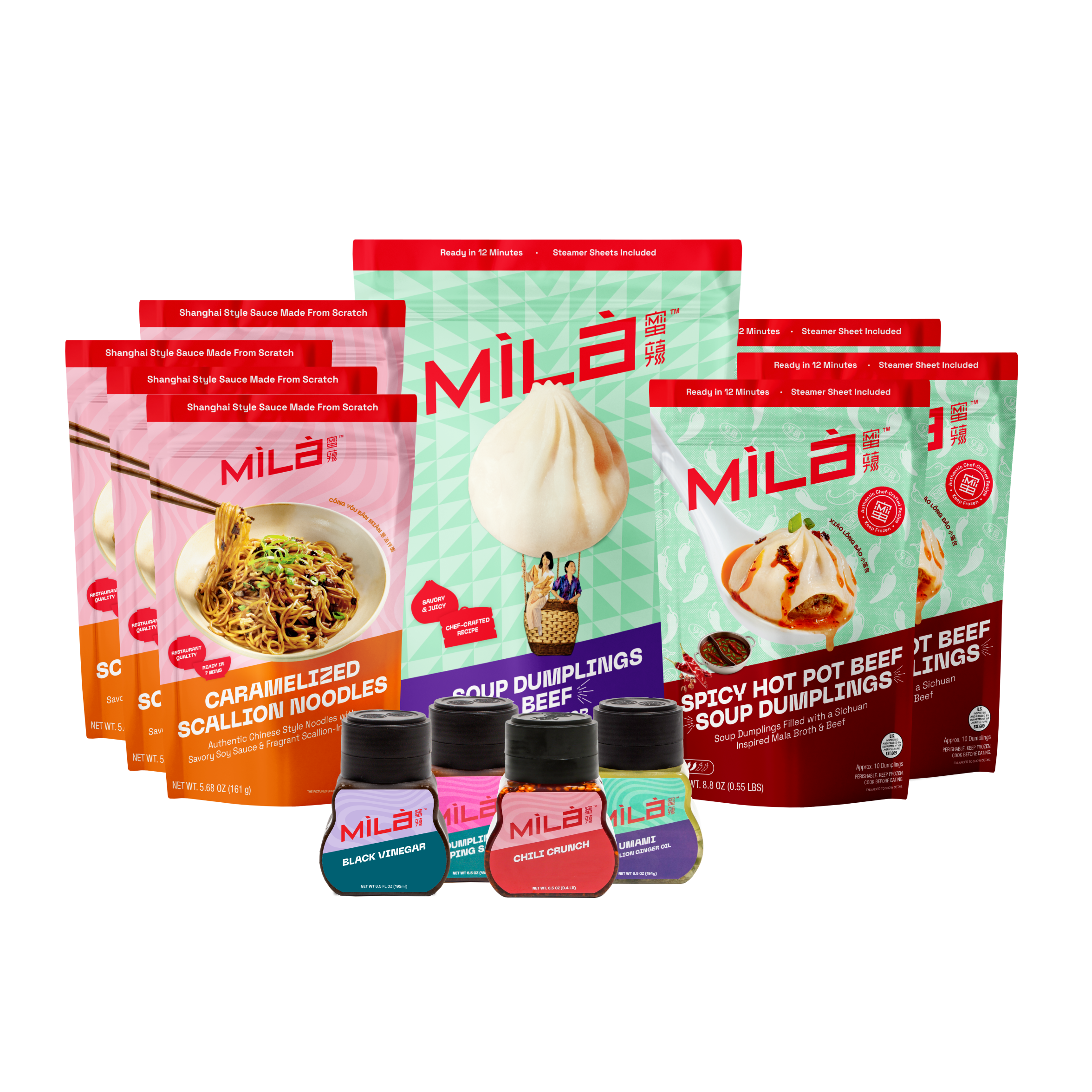 Both bundles come with a 3-pack of our limited-edition Spicy Hot Pot Beef Soup Dumplings (30 dumplings total) plus an adorable cooler bag to carry you from one celebration to the next. You’ll also get classic MìLà must-haves like jasmine green tea ice cream and all four of our chef-crafted sauces - because Lunar New Year deserves a full flavor lineup.